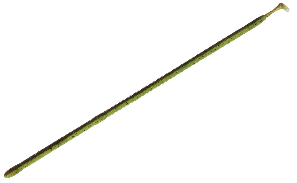 The vibrations of the shad tail are transmitted, causing the body to vibrate as well! Combined with the weak yet versatile shape changes unique to the long and slim body, it creates a unique finesse appeal.The top view has a ribbed shape, which creates a spontaneous crawling action with a sense of unity, as if there was no headband. On the other hand, the side view has no ribs, ensuring thickness. It serves as a headband to improve hook setting and needle retention when using a Neko rig. A slightly taut material that produces optimal repulsion even though it is slender. It responds quickly to rod work and creates a smooth action that spreads out as soon as the line tension is released. The salt content is medium gravity, which is balanced so that it does not sag too much when used with a Neko rig and maintains a natural posture, and when used with a no-sinker wacky rig, it creates a spontaneous action. By blending shrimp, squid, and baitfish powder, the smell alone will induce a bite.