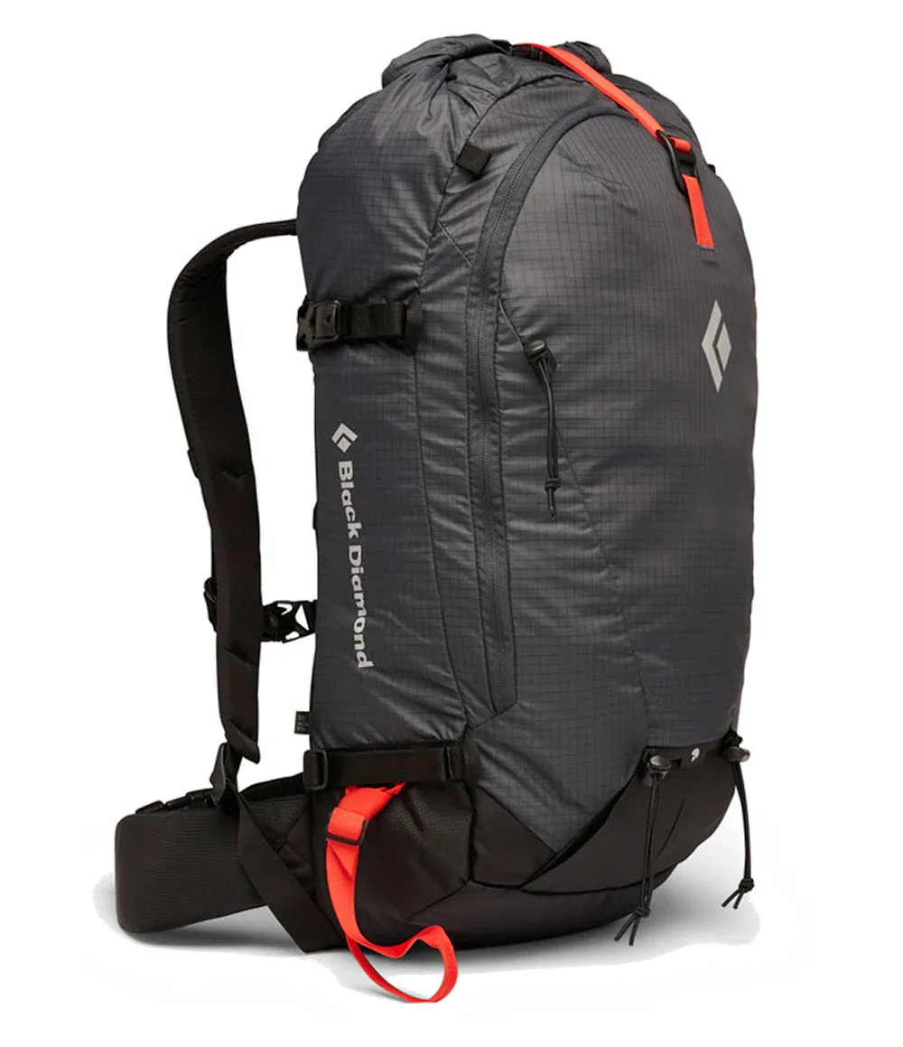 - Mid-capacity roll-top ski mountaineering pack made from lighweight and durable 210D nylon fabric with Dynex grid.