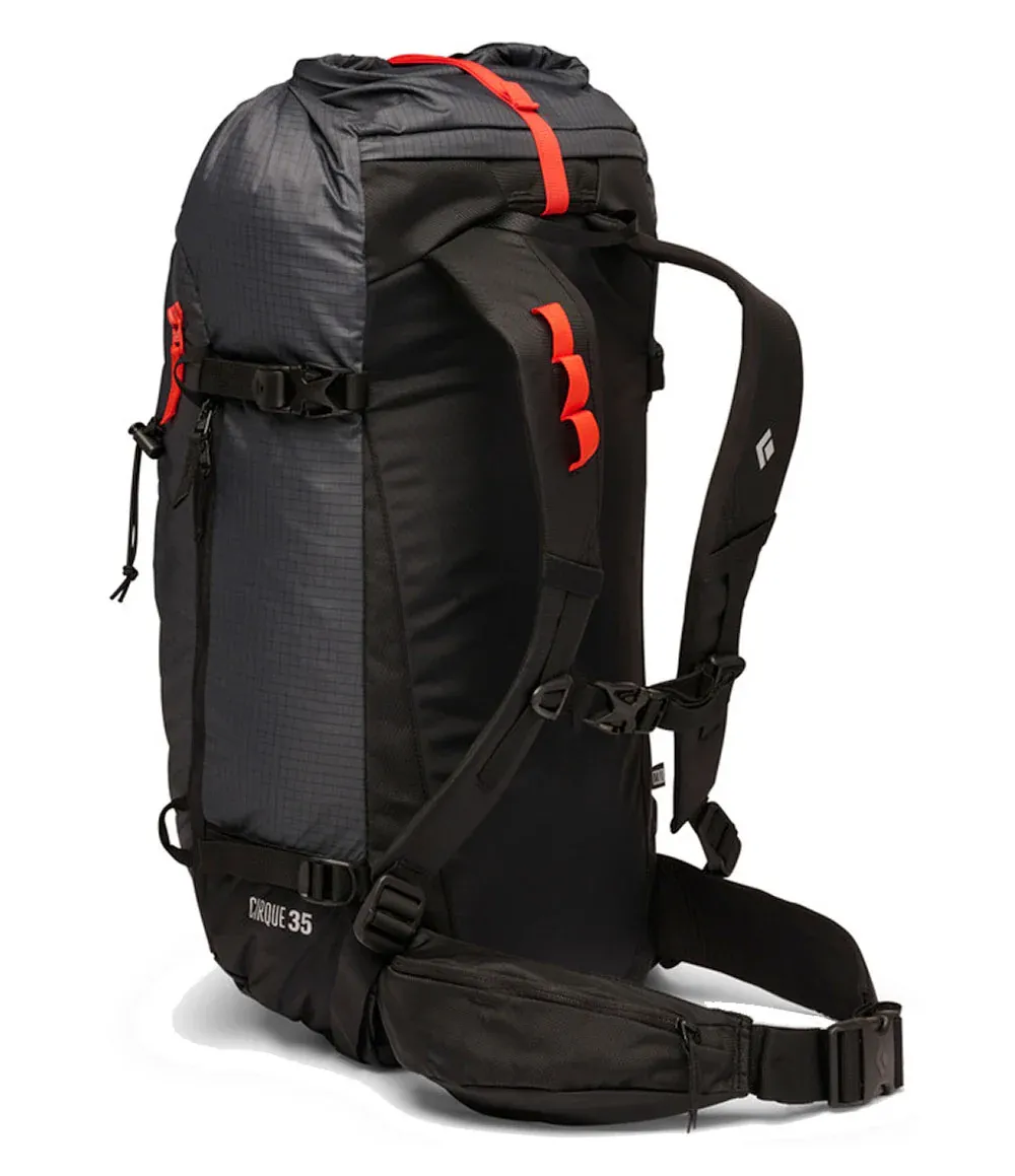 Clean, simple and purpose-built for demanding ski lines from the Chugach to Chamonix, the Black Diamond Cirque 35 is our technical ski mountaineering pack with a mid-sized capacity. The Cirque 35 has a roll-top main compartment, an externally accessed avy safety pocket, and a quick-access side pocket to stash skins or ski crampons. Both A-frame and diagonal ski carry systems make transitions seamless. A padded waistband adds extra cushion and stretch-woven padded shoulder straps allow for a comfortable carry. Quick-deploy PickPocket piolet carry system is compatible with ice axes or tools and comes in handy during unexpected sections of steep terrain.