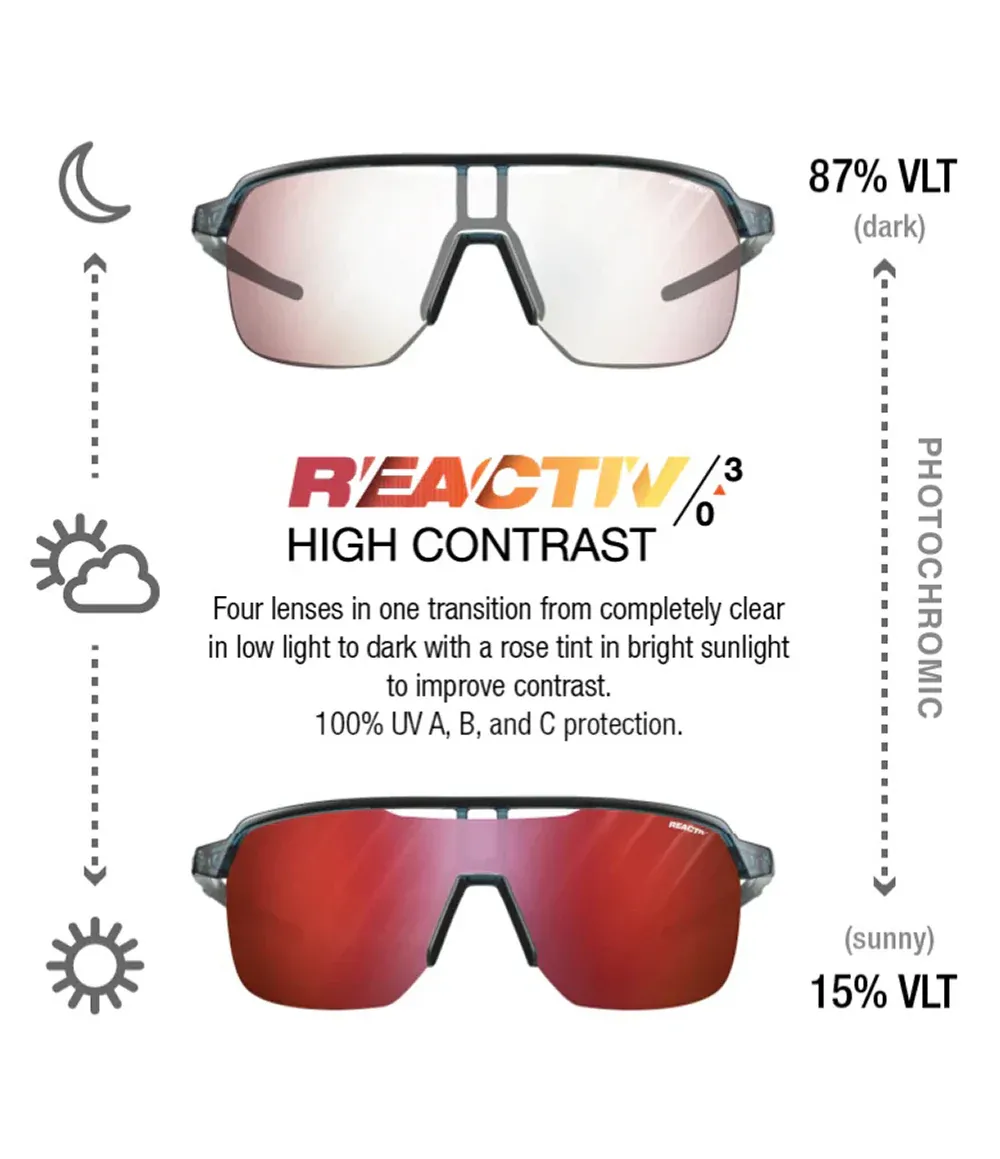 - REACTIV Photochromic — Julbo’s industry leading REACTIV Photochromic lenses adjust to changing light conditions and offer outstanding optical quality, making them the best performance eyewear on the market.