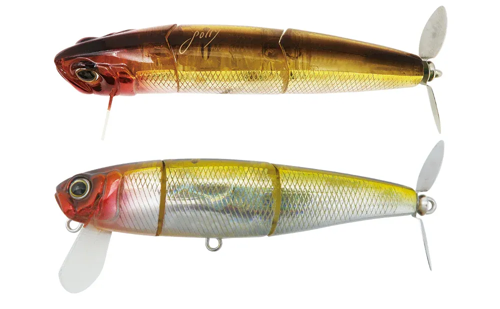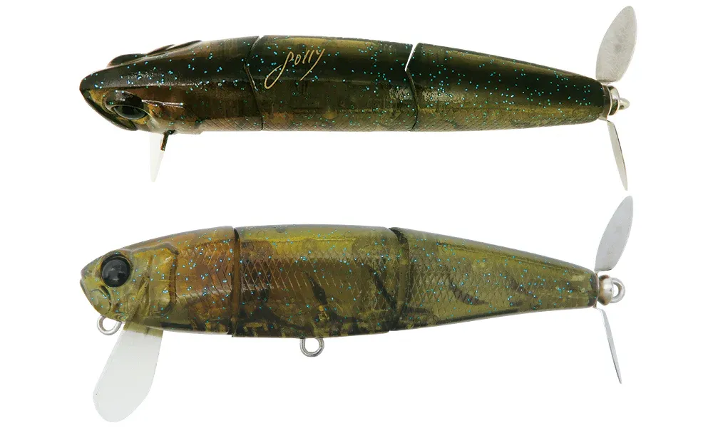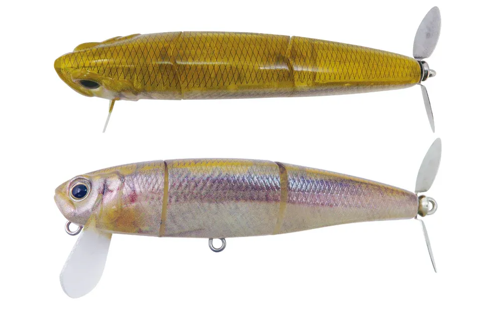 A sinking swisher that can pull the middle layer in a dead throw and stimulate the bass with multiple elements such as flashing, rubbing noise, and water flow produced by the prop that rotates at high speed. While wearing these effective performance under high pressure, Jolly added a lively body action. The soft roll action changes the shape and color of the body intricately, improving both fish-attracting power and bite-inducing power. Based on a slow retrieve at a constant speed, it becomes a wake bait that makes undertow and swish sounds when the rod is set up and reeled in at the same time as it hits the water. In the super dead slow retrieve, the prop rotates at high speed while the body shakes slightly. Furthermore, by winding while shaking, it creates a roll action with a smaller moving distance and induces a bite. In addition, the wide lip, which is set slightly vertically, is good at avoiding the cover, and greatly contributes to improving the “ease of getting caught”, which was the weak point of the sinking swisher. It is a next-generation sinking swisher that surpasses the same category.