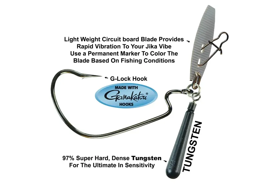 Picasso Tungsten Jika Vibe Gamakatsu Version – Named after the popular Japanese technique the Tungsten Jika Vibe is a cross between several techniques including the drop shot, wobble head, and Texas Rig, and now has the added benefit of a small circuit board blade that creates vibration to entice a strike. The design of the Tungsten Jika Vibe keeps your plastic bait off the bottom and out of the silt. The free-moving hook creates a live action of the plastic trailer. It can be rigged with any soft plastic trailer including worms, creature baits, lizards, and swimbaits. Being extremely versatile the Tungsten Jika Vibe’s tight action allows it to come right through eel grass and also flipped into heavier grass, fished on the bottom along creek channels, grass lines, ledges, and rocky points. It is also effective pitching into blowdowns and working through brush piles and other submerged cover where the bass typically hide. Try hopping the Jika Vibe along the bottom with slight lifts of the rod or use a steady retrieve to “tick” along the bottom. Equipped with a premium Gamakatsu G-Lock in an assortment of sizes to perfectly match your plastic trailer. Fishing Tip- For the ultimate fish attraction use a permanent marker to customize the color of the circuit board blade based on water clarity and time of year.